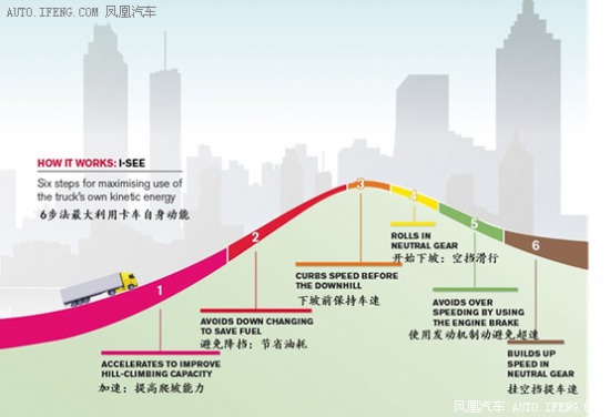 I-See系統(tǒng)的“6步法”最大利用卡車自身動(dòng)能:在上坡前進(jìn)行加速;在接近坡頂處盡量避免減檔;快要下坡時(shí)不加速,而是等待重力來(lái)發(fā)揮作用;在下坡的前期依靠慣性前進(jìn);在下坡快要結(jié)束時(shí)開始剎車;下坡結(jié)束后放開剎車,在新的上坡之前進(jìn)行加速。