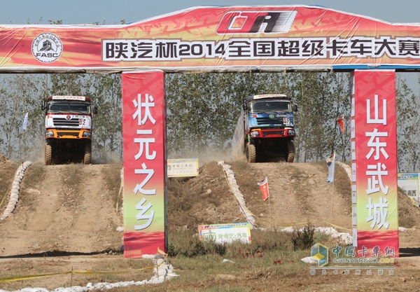 本站比賽較之去年有所變化。在賽道設(shè)計方面,保留起伏連綿的三連峰、水花四濺的深水坑、考驗車技的波浪路、以及高低起伏的炮彈坑。尤其此次武城天氣干燥,高速側(cè)坡路段雙車齊驅(qū),揚塵飛舞,增加了賽車通過性的難度,對賽手預(yù)判路面帶來很大考驗。賽手方面:在原有實力車隊的基礎(chǔ)上,加入了新鮮的血液。既有老牌實力車手李陽、李國印、王帥等,也有80后黑馬車手像龔氏兄弟、魏好、魏金沙等新銳車手。新鮮血液的加入,為整個賽事增色不少。賽車改裝方面,使用改裝之后的陜汽德龍F3000——該車型增加了對轉(zhuǎn)向系統(tǒng)、前后減震系統(tǒng)的改裝,并改進了冷卻系統(tǒng)的高壓強冷設(shè)備、制動系統(tǒng)的剎車輔部件以及底部保護鋼板,增大了減震鋼板的減震行程,提高減震效果。大大提高了賽車的越野性能。